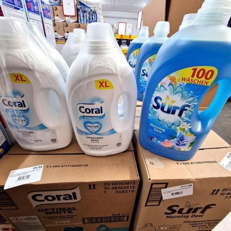 Todos los pallets de detergente para ropa se venden como excedente o producto B stock.