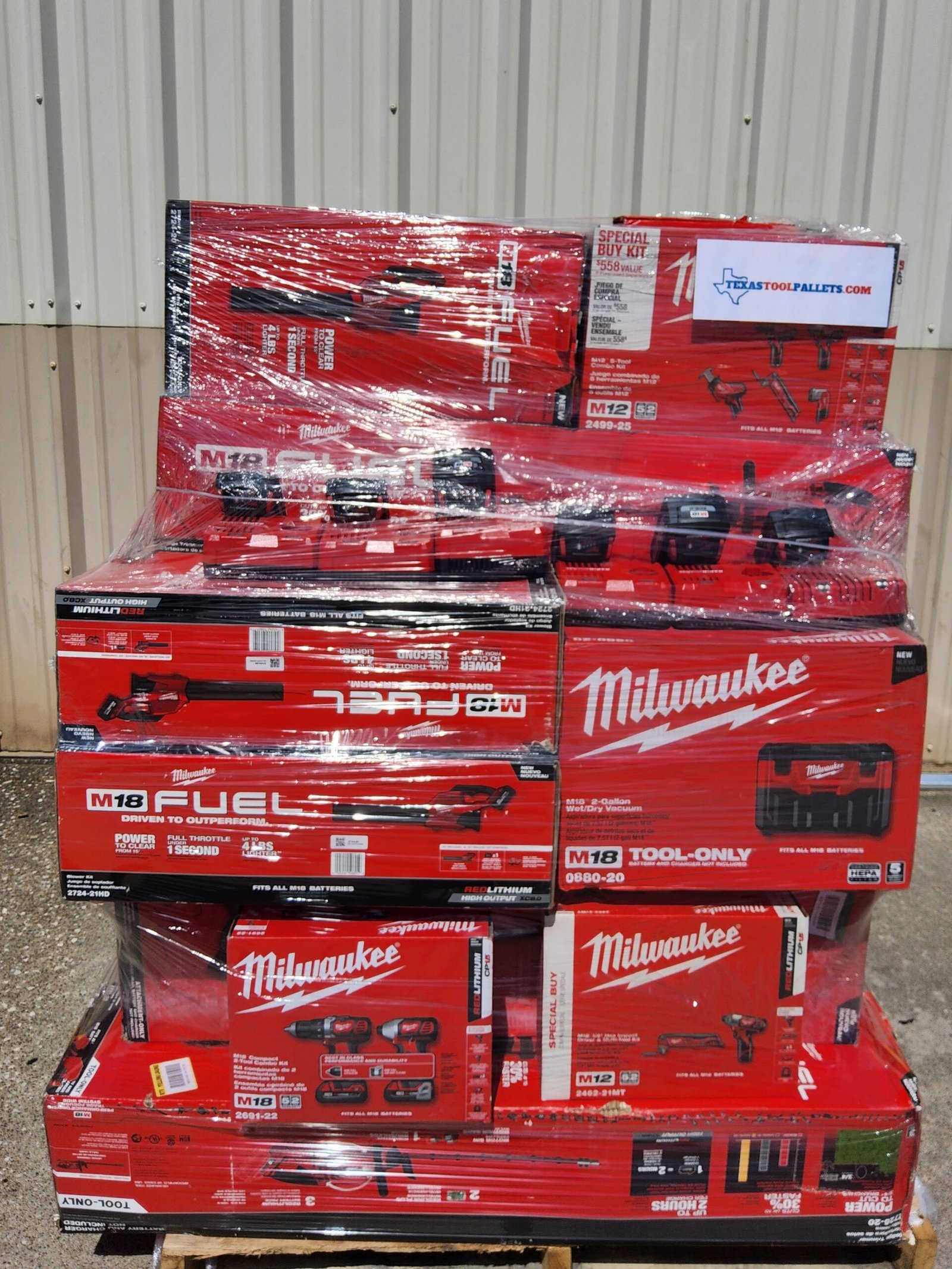 Cada pallet de Milwaukee tools contiene un surtido profesional de herramientas y accesorios.